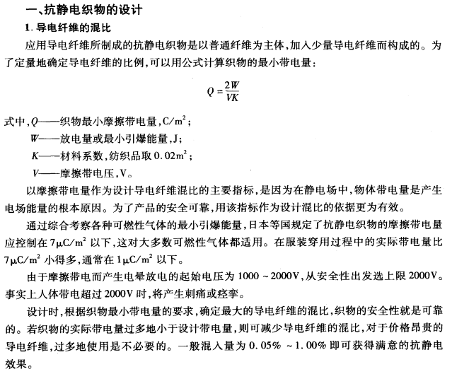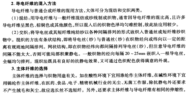 导电纤维通常用于制成抗静电织物,它能有效地预防静电的局部积聚,使静电很快泄漏,同时通过电晕放电向大气中释放电荷。导电纤维所制抗静电产品的类别和性能要求如下表所示。