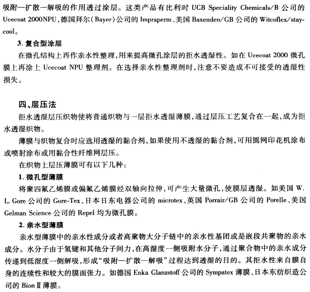 使织物获得拒水透气功能,有多种不同的方法,依据的机理也各有不同,现分述如下:
