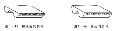 同步带按齿形分类可分为梯形齿同步带和圆弧齿同步带两类。如图1-45、图1-46。圆弧齿同步带和梯形齿同步带相比,齿根应力集中小,寿命更长,传递功率比梯形齿高1.2~2倍。