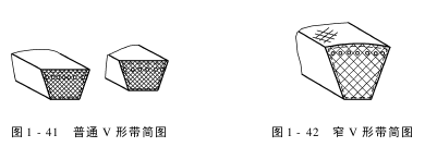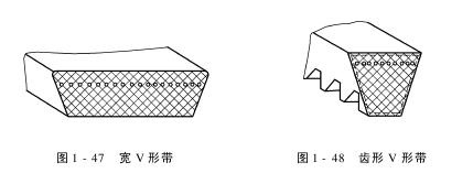 如图1-48。齿形V形带承载层为绳芯结构,内表面制成均布横向齿的V形带。它散热性好,和轮槽粘附性好,是曲挠性好的V形带。