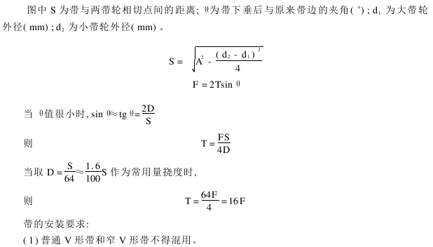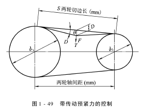 测量张力的方法:在带和两带轮的切点间的长度S中点处施加一垂直于带的压力F,使其产生挠度D,如图1-49所示,就可得出带的张力T,这些因素之间的关系式如下: