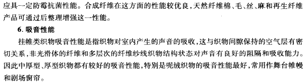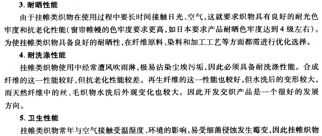 挂帷类织物具有遮蔽、调节、隔离等有用功能,其使用特点是悬挂使用和界于室内和室外之间,基于此,这类织物必须具有以下一些独特性能: