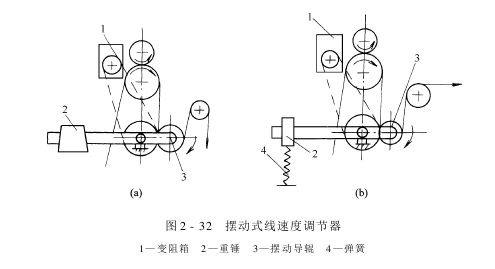图2-32所示是摆动式线速度调节器,可分为重锤和弹簧摆动式两种。由摆动式线速度缓冲装置和电气调速机构组成。其基本原理和升降式相同,仅是织物因线速度变化而产生的张力变化引起缓冲机构的摆动,而不是辊的升降。此摆动使链条带动变阻箱改变电阻,从而达到自动调节前后单元机线速度差异的目的。
