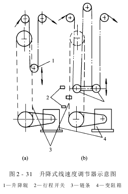 图2-31是升降式线速度调节器的示意图。主要由导布辊、链轮、变阻箱和机架等部分组成。根据导布辊的数目,升降式线速度调节器又可分为三辊式和五辊式两种,如图2-31(a)和图2-31(b)所示。