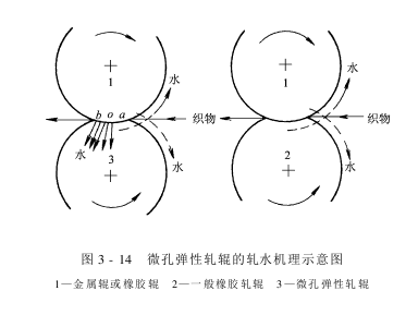 上述几种轧水机都是依靠轧车的轧压作用,把水分从织物中排解。这种轧压作用能排解的大部分是织物表面的水分,至于纤维或纺纱线空隙中的水分,则只能排解小部分。因此,单纯靠增大轧点压强来降低轧余率是有限度的。为了进一步提高轧水效率,出现了使用吸或吹的方法来排解更多水分的新型轧辊和轧车,这就是微孔弹性轧辊和压缩空气喷射式轧车。