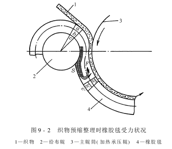 如图9-2所示,在进行机械预缩后整理时,橡胶毯随导辊而运行,伸长、压缩不断变换。进布时将织物紧贴在橡胶毯伸长部位a处。当橡胶毯围绕于给布辊时,外侧表面伸长,内表面缩短即a>b>c,运转至加热承压辊后,a段由伸长变化为缩短,b段不变(b为胶毯中部),c段发生伸长,这时出现a′<b′<c′。由于b=b′,因此a>a′。由于给布辊和加热承压辊之间的压力作用,使橡胶毯受到剧烈压缩而变薄伸长,而运行到S点时,这种挤压作用消逝,橡胶毯将向外恢复弹出,产生了向后挤压的作用力F,这个反作用力使得橡胶毯紧压于承压辊,也就将织物紧贴在了橡胶毯上,不能滑动。这样织物的形状将完全按橡胶毯变形,进入压缩区域,橡胶毯压缩,织物也随其压缩即发生收缩,从而达到了预缩的目的。当橡胶毯离开承压辊时,织物必须马上离开橡胶毯。因此橡胶毯在后面的导辊上又呈拉伸状态,如织物不及时离开橡胶毯将又会被拉伸而去除预缩效果。织物上的水分和加热作用增加纤维的可塑性,提高了织物的预缩效果。