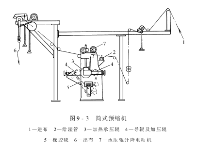(1)简式三辊橡胶毯预缩机:如图9-3所示,它由进出布装置、给湿装置及三辊橡胶毯预缩装置组成。其核心机构是三辊橡胶毯预缩装置,如图9-4所示,它由橡胶毯、加热承压辊、加压导辊及橡胶毯调节装置等组成,承压辊用蒸汽加热,给湿采纳水管喷雾给湿。