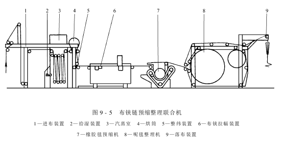 (2)布铗链预缩后整理联合机:如图9-5所示,全机由进出布装置、汽蒸给湿装置、短布铗拉幅装置、三辊橡胶毯预缩机及呢毯烘干部分组成。进出布装置由张力器、吸边器、喂入辊及布速测定仪组成。给湿采纳喷雾和汽蒸箱,以提高渗透吸湿效果。短布铗拉幅装置使织物平坦无折皱地进入三辊胶毯预缩机,并能依据工艺需要调整织物的喂入速度和经、纬向张力。预缩装置是预缩机的核心部件,由进布、加热承压辊、橡胶毯、加压辊、橡胶毯导辊及张力调节器、橡胶毯冷却等装置组成。呢毯烘干机的作用是对经三辊橡胶毯预缩的织物进行烘干定形,以保证织物的缩水稳定性,并能改善织物的手感和完泽。