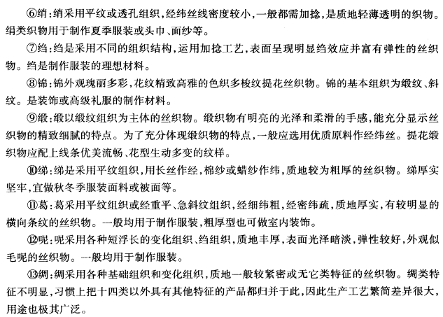 ⑤纺;纺采纳平纹组织,经纬一般不加捻,是表面细洁缜密的丝织物。纺也叫纺绸。是丝织物中生产工艺为简单的一种。适宜作普遍夏季工作装的布料及高级套装的里料和胖料。