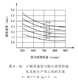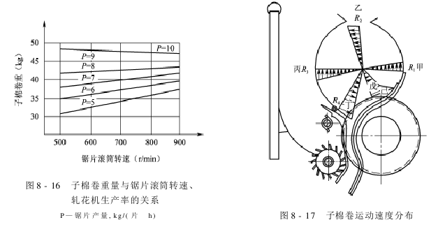 子棉卷密度的变化直接导致子棉卷重量的变化。如图8-16所示:子棉卷的重量取决于锯片滚筒的转速和轧花机的生产率。如果锯片滚筒的转速是固定的,则子棉卷重量增加,会提高轧花机的生产率,当锯片滚筒转速较低时,这种关系尤为明显。当轧花机的产量达到9~10kg/(片-h)以上时,提高锯片滚筒的转速几乎不能改变子棉卷的重量,有时反而使子棉卷的重量降低。