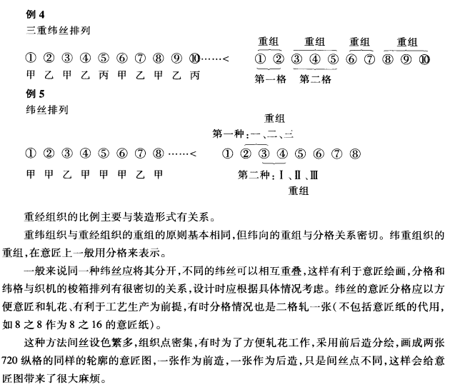 纹制设计的内容包含绘画意匠和轧制纹板等工作,并确定经纬组合及排列、经纬密度、梭箱排列、装造类型、纹针数及意匠绘画要点、纹针样卡等,此外,还要画意匠片断图、纹板轧法图、目板穿法示意图等。