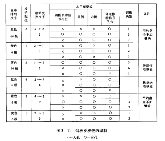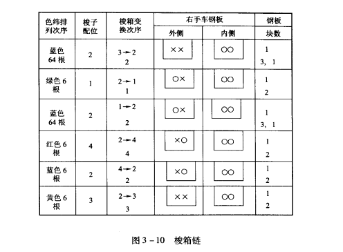 比较简单,不必进行梭子调配.可根据纬纱配色循环和梭子在梭座上的配位直接编制梭箱链。例如,纬纱配色循环为:蓝色64根,绿色6根,蓝色64根,红色6根,蓝色6根,黄色6根的织物,试选择合适的梭子配位并编制梭箱链。