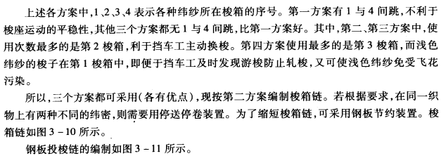 根据纬纱配色循环可知共需4个梭子,因每种纬纱每次连续引纬数都是偶数,所以可用1×4单侧多梭箱织机织制。梭子在梭座中的配位台很多方案,现做一些比较,如图3—6~图3—9所示。