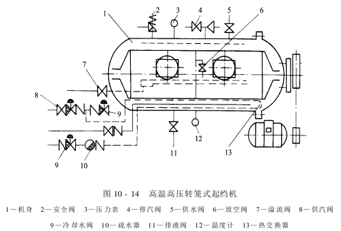 高温高压解捻松弛转笼式起绉机主要由筒体转笼、传动部分以及加液、加温系统和自动程序操纵器等组成,见图10-14所示。