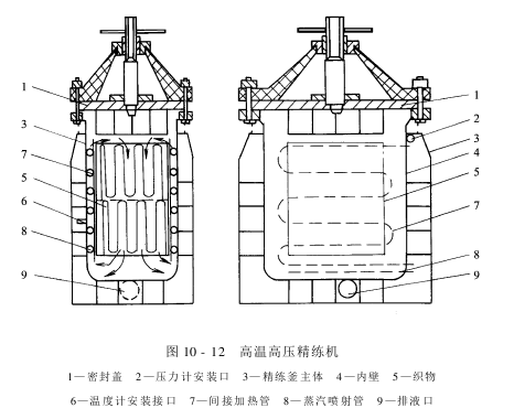 方形密闭式精练釜是高温高压精练机的主体,它由密封盖、加热装置和温度操纵系统等组成,见图10-12所示。