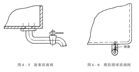 (3)橡胶圆球放液阀:它用于不锈钢水槽,如图4-6所示。在不锈钢槽的出液口,置一个软橡胶球,球的外径应比出液口内径大些,圆球两端和出液管上均有圆柱销钉,销钉间装两根不锈钢拉簧,以弹簧拉力将圆球紧紧堵塞放液口。放液时,操作人员将圆球拉离放液口即可。这种结构适用于冷水或温水槽。各种放液阀的分析对比见表4-3。