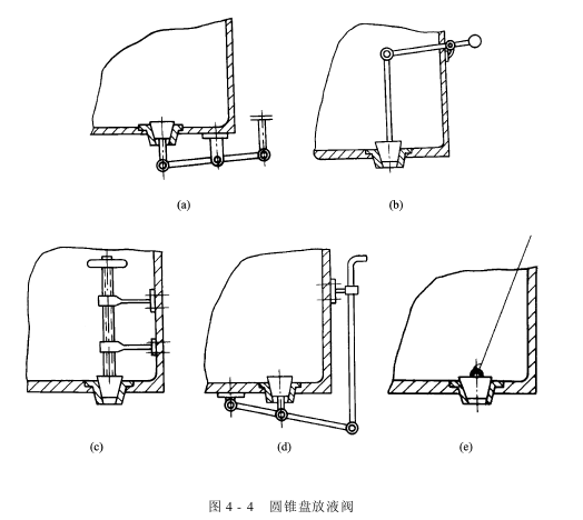 (1)锥盘放液阀:有脚踏式圆锥盘放液阀[见图4-4(a)]、手掀式圆锥盘放液阀[见图4-4(b)]、手动螺杆式圆锥盘放液阀[见图4-4(c)]、手拉杠杆式圆锥盘放液阀[见图4-4(d)]、手拉式圆锥盘放液阀[见图4-4(e)]数种,常用的为脚踏式圆锥盘放液阀和手拉式圆锥盘放液阀两种。