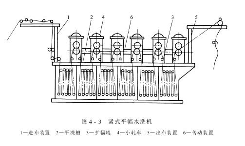 一般紧式平幅水洗机由进布架、平洗槽、扩幅装置、小轧车、线速度调节装置、传动设备和出布架等组成,如图4-3所示。若平洗机前后和其他单元机械(如浸轧机、蒸箱、烘燥机等)相连接,则进布架和落布架可省去。