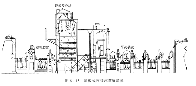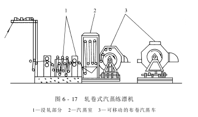叠卷式汽蒸练漂机既具有轧卷式汽蒸机的特点,又实现了连续化生产,提高了生产效率,可用于轧碱汽蒸煮练、过氧化氢和亚氯酸钠的汽蒸漂白以及次氯酸钠的漂白,如图6-18所示。