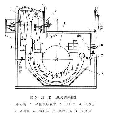 该机由汽封进布装置、汽蒸箱、折叠堆布装置、输送机构、水封出布装置、轧液辊、加热保和气传动机构等部分组成,如图6-21所示。输送织物的机构由主动回转的中心辊和主动运行的半圆弧形履带组成。左右两侧有有效宽度调节板,可根据平幅织物幅度要求手动调节。平幅织物浸渍处理液后经汽封口进机,先在上下导布辊间汽蒸加热,再经多角辊、落布斗折叠落堆于缓慢运行的半圆弧形输送履带上。有时履带下部浸在处理液中,并有直接和间接蒸汽加热管使处理液加热和保温。如果煮练即可煮沸,它比只经汽蒸的织物效果佳。织物在处理液中由中心辊和弧形履带输送,张力很小,可供对张力敏感的机织物、针织物物退、煮、漂,不易产生折痕。该机也可仅作汽蒸而不经液煮,视工艺要求而定。汽蒸温度为97~100℃,液煮为95~98℃,容布量有2000m、4000m、6000m、8000m等多种规格,布速为35~100m/min。