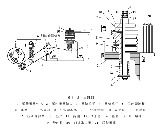 (4)引纬时纬丝飞行开始时间及引纬终了纬丝飞行终止的时间,可调整压纱器凸轮A和B的位置来设定。