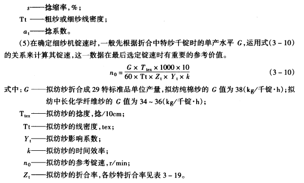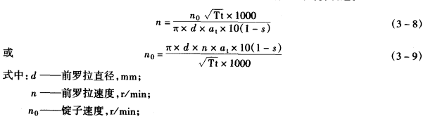 (4)细纱机纺制细持纱时,为了达到和中、粗持纱相同的加捻程度,需要较高的锭速,但又要把锭速确定在机型同意的范围内。为此,一般先确定锭速,然后按式(3-8)计算前罗拉速度。反之,纺制粗特纱时,可先确定前罗拉速度,然后按式(3-9)计算锭速。