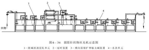 圆筒针织物物自下而上包在该扩幅器外运行。扩幅器外有两只环形喷淋管向针织物物喷淋70~80℃淡碱液,针织物物经轧液后,再经充气形成气鼓喷淋热淡碱液,去碱轧液后进入水洗出布装置。