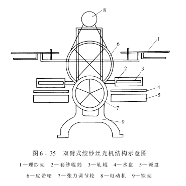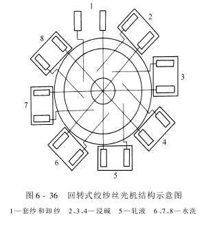 在5中轧液部分处设有一根轧液辊,以轧去多余的碱液。6、7、8为水洗部分,各设有喷水管、轧辊和盛水盘。盛碱盘能自动升降,盛水盘和残碱贮槽相通。轧辊由硬橡胶制成,由油泵施压,能自由升降。整个回转装置,套纱辊间的距离,转向的交替更换,碱盘的升降,轧辊的升降,喷水管的启闭,都能自动操纵。