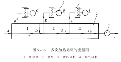图5-22为多次加热循环的流程图。从A点补充新奇空气和Ⅰ室D点返回空气混合后成B点状态,经加热器加热升温至C点状态,由循环风机输送至烘房内,和织物接触变为D状态。