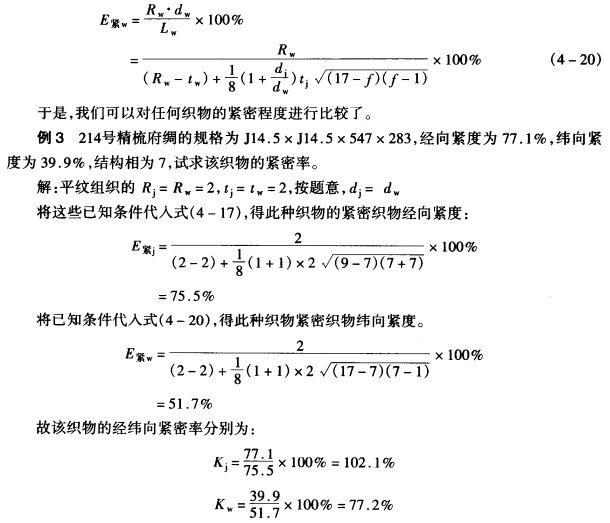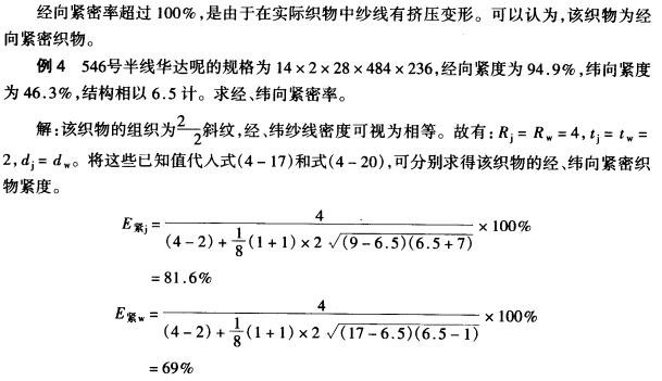 比较例1和例4还可以看出,即使是相同的经纬纺纱线密度、相同组织的织物,当结构相不同时,其紧密织物的紧度(经向和纬向)是不相同的,即织物的可密性是不同的。
