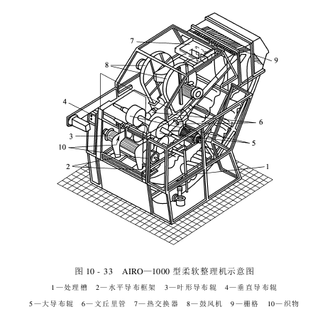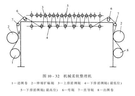 真丝织物机械柔软后整理的方法较多,可在单辊筒后整理机上轻轧或在拉幅机上轻微拉幅,也可用专用的机械柔软后整理机,如图10-32所示。