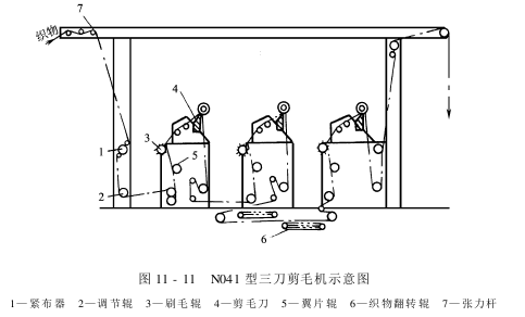 图11-11所示为N041型三刀剪毛机示意图,它主要由进出布装置、三组剪毛机构、织物翻转装置及传动装置组成。织物由进布装置导入剪毛机构剪毛,经翻转装置可实现双面剪毛。