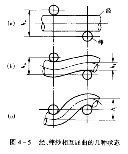 由于经、纬纱在织物中是相互紧密连接的,因此,一个方向的纺纱线如果伸直一些,另一个方向的纺纱线就必定要多屈曲一些。换言之,一个方向纺纱线屈曲波高减小一些,另一个方向纺纱线的屈曲波高就要增大一些。可见,经、纬纱屈曲波高之间是相互关联的。再进一步说,如果一个方向的纺纱线完全伸直,另一个方向的纺纱线就会达到大的屈曲波高。图4—5(a)所示为经纱呈完全伸直状态,而纬纱具有大的屈曲;图4—5(c)所示为纬纱呈完全伸直状态,而经纱具有大的屈曲。这两种结构状态为织物中经、纬纱相互配置关系的极端状态,在实际织物中是不存在的。实际上各种织物的几何结构必定处于达两种极端状态之间,如图4—5(b)所示。