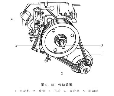 织机的传动装置是由电动机、V形皮带盘、离合器机构、开关机构、制动机构及防逆转机构等组成,如图4-18所示。织机由电动机1驱动。电动机1通过V形皮带2传动两只飞轮3。