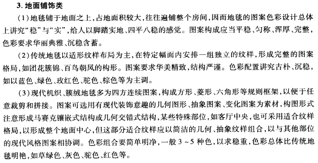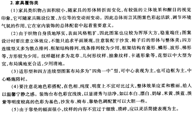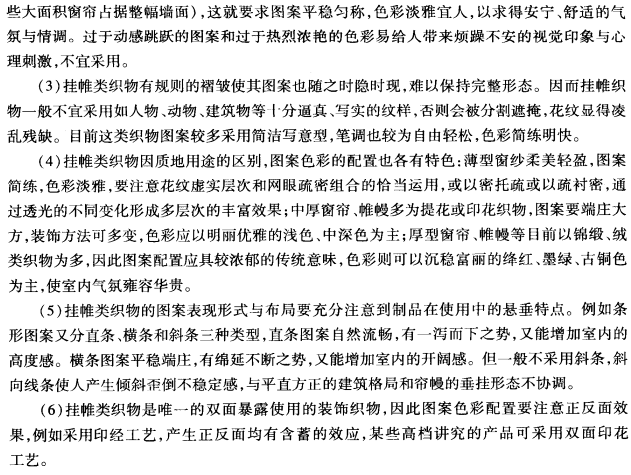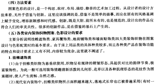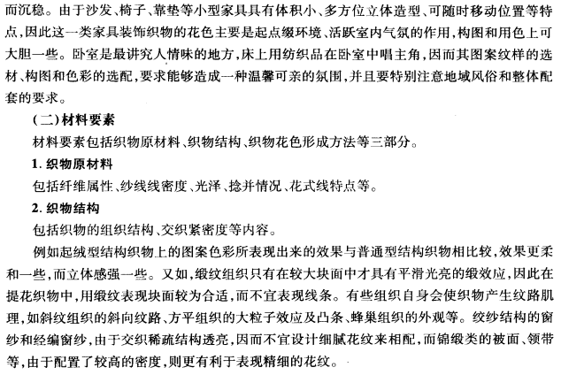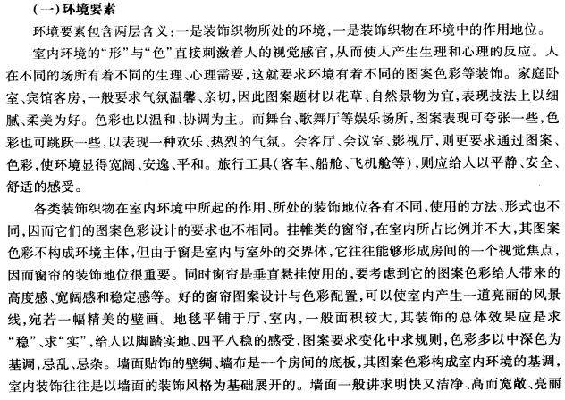 在现代室内环境中,除了室内造型、家具陈设、灯完、绿化等外,还大量使用装饰织物,借助其花纹图案和色彩的效果,协调整个室内的风格基调。装饰织物的图案和色彩设计应综合考虑许多要素,如环境些素、材料结构要求、市场要素等。