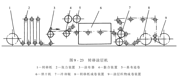 PU涂层后整理机中重要的单元装置有涂布器、烘干装置、退卷和上卷装置、轧平和冷却装置。