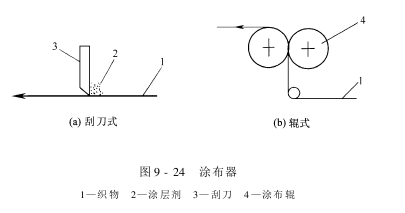 PU涂层后整理机的关键单元是涂布器,主要有刮刀式涂布器、辊式涂布器、圆网涂布器、粉末涂布器等。它的基本形式有刮刀式涂布器和辊式涂布器两种,如图9-24所示。