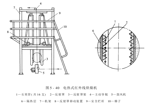 (1)电热式红外线烘燥机:如图5-40所示。它的红外线辐射器是电热石英管式红外辐射器(图5-41)。石英管套在电热丝外,搁在石棉垫上,再套上黄铜套管,用上卡箍夹紧。套筒上有三条轴向长槽,以增加弹性。辐射器借两端套筒夹紧在框架的弹簧夹里。石英管除用来固定电热丝,减少电热丝的氧化腐蚀外,还起着透射红外线和减少对流热损耗的作用。