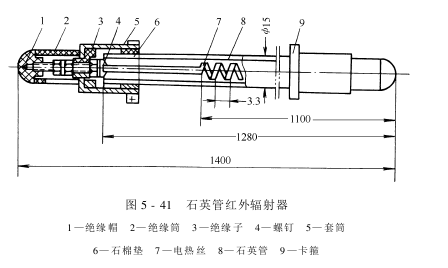 常用的石英管外径为12~13mm,壁厚为1.5~2mm,长为1~1.5m,配装2~2.5kW电热丝。石英管不能承受机械冲击,使用时应非常注意。电热丝是把电功率转变为热功率的主要元件,其温度和通过它的电流、电热丝材料、直径、卷绕外径、螺距等有关。一般通过调节电压来操纵电热丝温度,以获得所需的辐射波长和辐射功率。