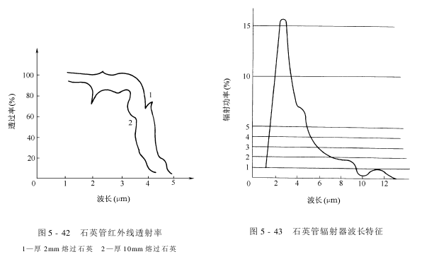 石英管用作辐射元件的特点是绝缘性和耐热性好,并能将电热丝辐射出来的λ<4μm的红外线几乎全部透射,λ≥4μm的则几乎全部汲取(图5-42)。汲取后石英管温度升高,又进行二次辐射,其波长特征见图5-43。