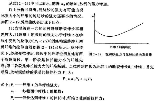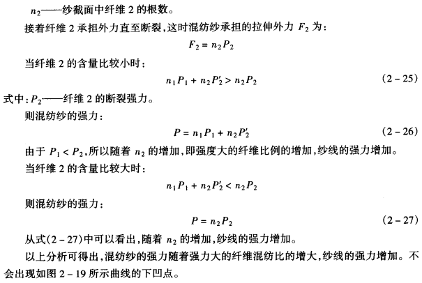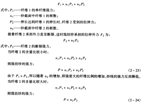 从式(2—22)可以看出,由于P2>P1,所以随着n2的增加,纺纱线的强力增大,即随着混纺化纤织物纱中强力大的纤维混纺化纤织物比的增加,混纺化纤织物纱的强力提高。