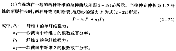 2.混纺化纤织物纱的强力 混纺化纤织物纱的强力并不像直观想象的那样,强力弱的加上强力大的就肯定得到一个强力中等的。它不仅和纤维的强力有关,还和混纺化纤织物纤维的伸长能力的差异紧密相关。