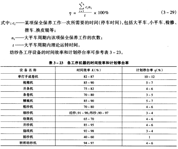 设备在运转过程中,由于需要落纱、接头、布置工作地及工人自然需要等,会造成肯定的停车时间,使实际运转时间少于理论运转时间,因此实际产量少于理论产量。