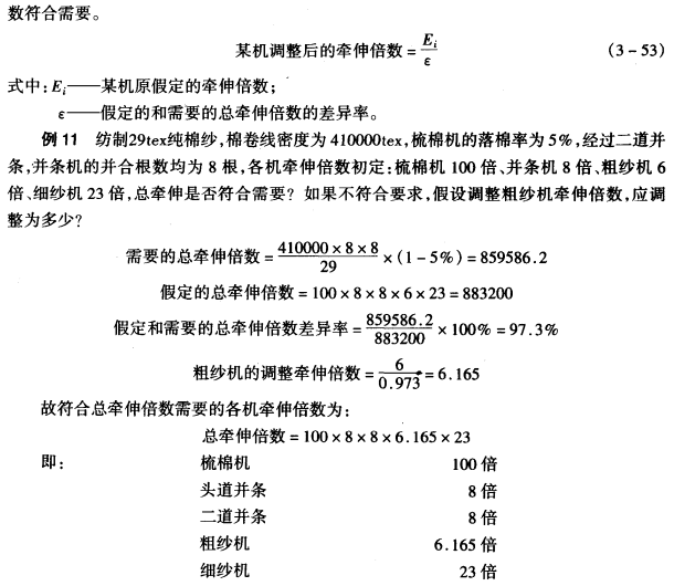 (1)根据棉卷线密度、拟纺细纺纱线密度、梳棉机落棉率及各机喂入并合数,算出需要的总牵伸倍数。