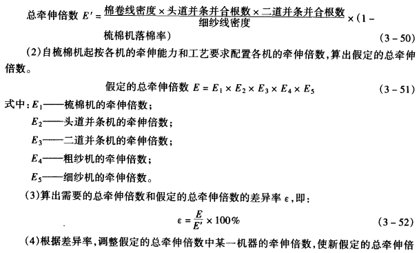 纺纱工程各机的牵伸倍数恰当和否不仅影响产品质量和纺纱成本,同时直接影响各机的定额产量和设备机台数的多少。所以,要计算出总牵伸倍数,并将之进行合理分配。