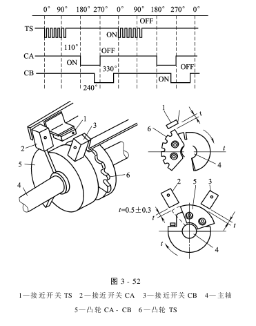 储纬头的动作,应和织机的启动和停止同步。当织机启动后,运转至喷嘴出水的角度时,储纬器的指棒(电磁钩)抬起,同时压纱器也松开,喷嘴内的水流将纬丝带出,完成引纬过程。当纬丝飞行到头后,指棒放下,压纱器闭合,幸免纬丝松弛。这里指棒和压纱器的吸合或断开都和织机的运转角度有紧密关系。所以储纬器必须要求织机提供运转信号及基准信号,A储纬器信号、B储纬器信号。上述信号一般使用三只接近开关操纵。其安装调试方式见图3-52。