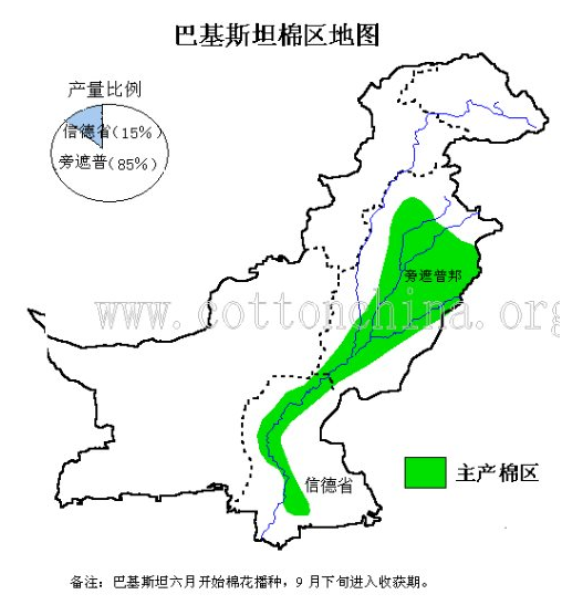 巴基斯坦是一个农业国家,农业人口占90%,生产大米、小麦和棉花。棉花是巴基斯坦主要经济作物和出口创汇资源。巴基斯坦棉花主要种植在东部和印度接壤的旁遮普省、信德省和西北边区省。两省属典型的大陆性气候,无霜期长,且印度河流域良好的灌溉条件,加上棉花生长期间70~90%为晴好气候,成熟和收花期基本无雨,优越的自然条件有利于棉花生长,无霜后花、青铃花,纤维品质好。上述以旁遮普省产量多,约占全国产量的55%,信德省约占35%,其它棉区约为10%。