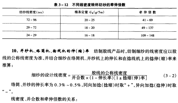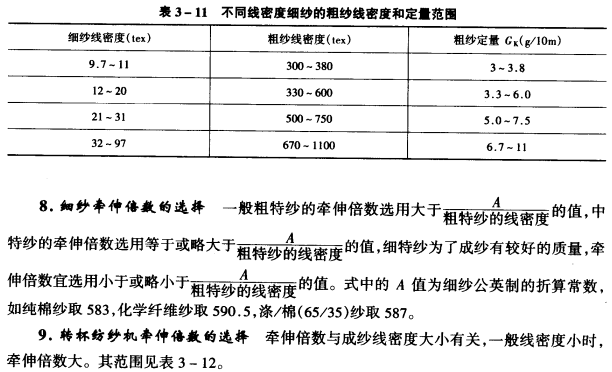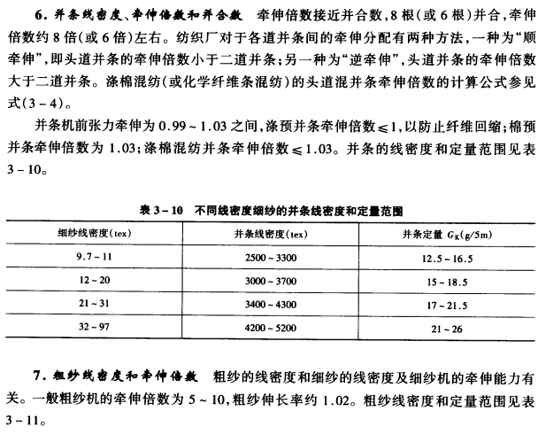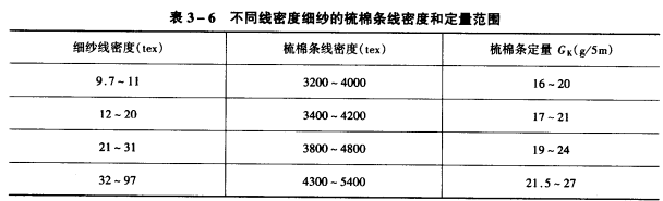 3.预并条线密度、牵伸倍数和并合数 一般6~8根并合,相应取6—8倍左右牵伸倍数,并合数增加可提高小卷中纤维的伸直度和平行度,改善精梳条质量,减少精梳落棉率。不同纱特细纱的预并条线密度和定量见表3—7。