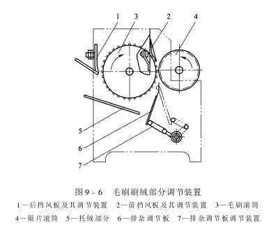 排杂调节板、托绒板也是和毛刷滚筒同心的圆弧板。排杂调节板可前后、上下移动,以便调节排杂量。