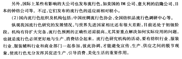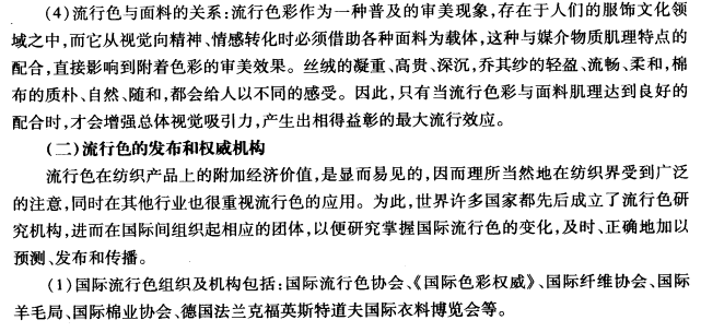 (2)不同地区的区别:国际流行色对世界各国的而料市场有着明显的指导作用,其影响是宏观性的。但对于不同国家及地区而言,则相对会有许多变化,流行时间的先后、长短也有差别,而现代交通、通讯、贸易的进展。又会反过来冲击国际色彩潮流的趋向。